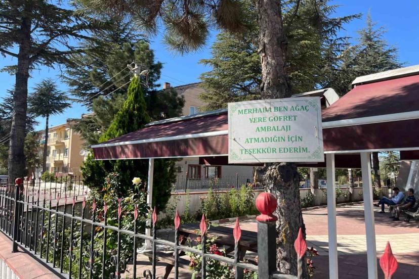 Eskişehir’deki bir cami bahçesindeki ağaçlara asılan yazılı tabelalar, çevre temizliği konusunda farkındalık oluşturuyor.