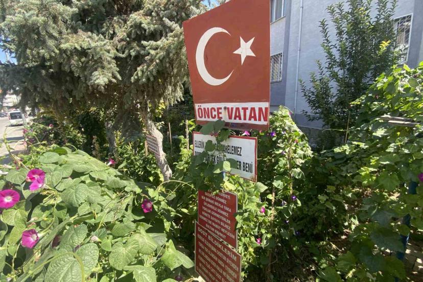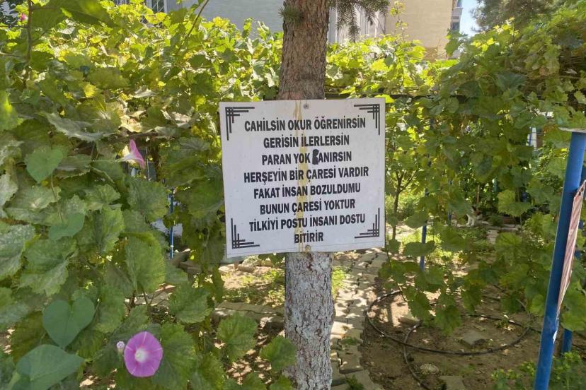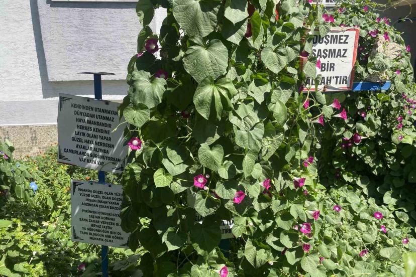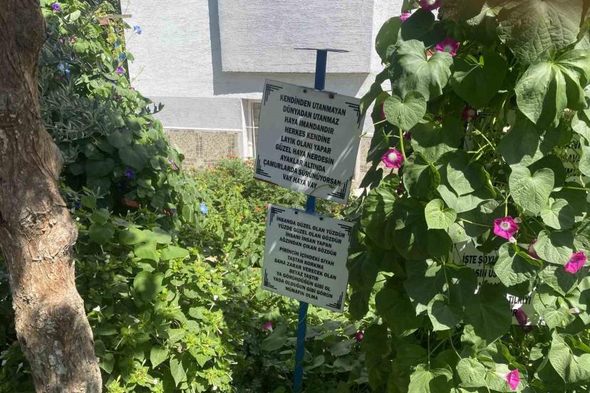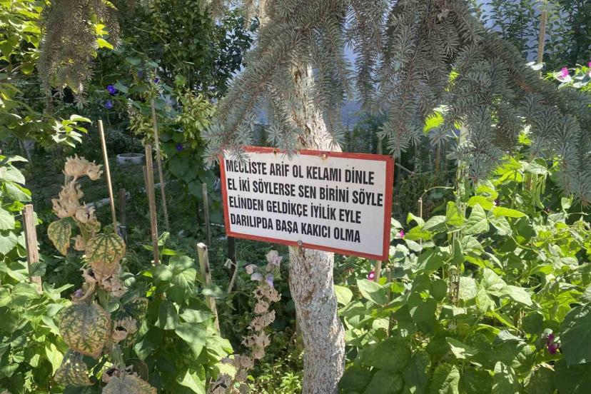 Bayram amcanın bahçeye yerleştirdiği özlü sözler dikkat çekiyor