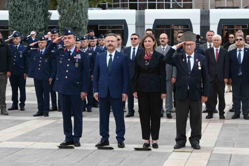 Program, Eskişehir Valisi Hüseyin Aksoy, Muharip Hava Kuvveti ve Garnizon Komutanı Orgeneral Rafet Dalkıran ve Eskişehir Büyükşehir Belediye Başkanı Ayşe Ünlüce’nin Atatürk anıtına çelenk sunumuyla başladı. Çelenk sunumunun ardından saygı duruşunda bulunularak İstiklal Marşı okundu.