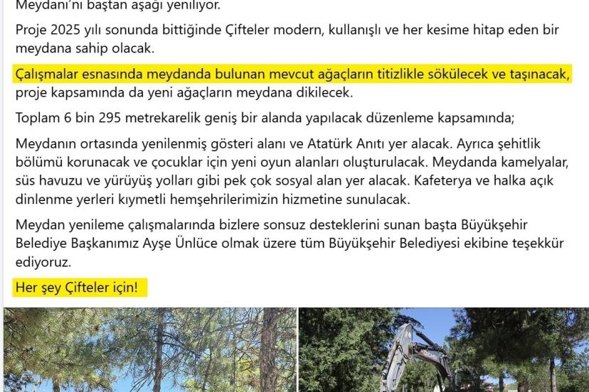 "Cumhuriyet Meydanı yenileniyor, Çifteler’in çehresi değişiyor. Eskişehir Büyükşehir Belediyesi Park ve Bahçeler Dairesi Başkanlığı, ilçemiz Cumhuriyet Meydanı’nı baştan aşağı yeniliyor. Proje 2025 yılı sonunda bittiğinde Çifteler modern, kullanışlı ve her kesime hitap eden bir meydana sahip olacak. Çalışmalar esnasında meydanda bulunan mevcut ağaçlar titizlikle sökülecek ve taşınacak, proje kapsamında da yeni ağaçlar meydana dikilecek."