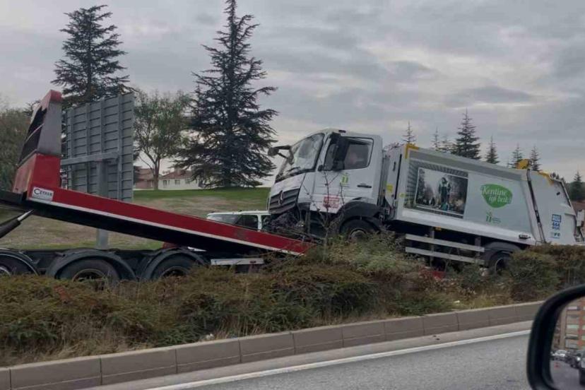 Kontrolden çıkan çöp kamyonu ağaçları yatırarak refüje çıktı