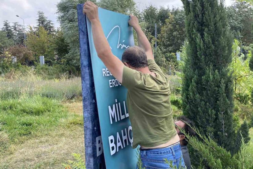 Eskişehir’de Millet Bahçesi’nin girişlerinde Recep Tayyip Erdoğan’ın isminin kazındığı tabelalar Vali Hüseyin Aksoy’un talimatıyla hızlıca yenilendi.