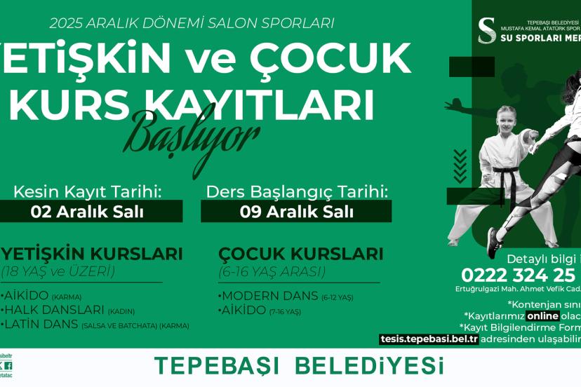 Tepebaşı Belediyesi Mustafa Kemal Atatürk Spor Tesisleri Su Sporları Merkezi’nde 2025 Aralık dönemi çocuk ve yetişkin kursları için başvurular 2 Aralık’ta online olarak başlayacak. Modern dans, aikido, halk dansları ve Latin danslarının yer aldığı eğitimler 9 Aralık’ta başlayacak.