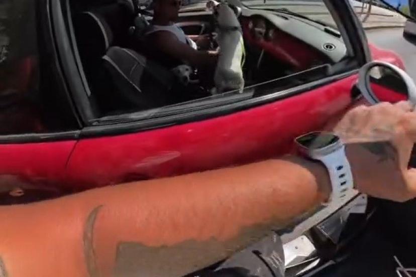Eskişehir’de işlek bir caddede seyreden bir motosiklet sürücüsü, trafikte beklerken yanında bulunan araç içindeki köpeği sevmek için açık camdan hamle yapınca, sevimli hayvanın 2 kez hırlamasıyla irkildi. Kask kamerasına yansıyan gülümseten olay sonrası, motosiklet sürücüsü araçtan hızla uzaklaştı.