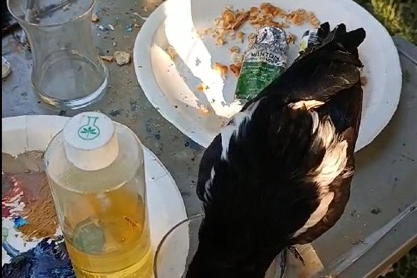 Eskişehir’de parkta resim yaparken bir karga tarafından öncesi fırçası sonra boyası çalınan ressam, sevimli hayvanın hallerin...