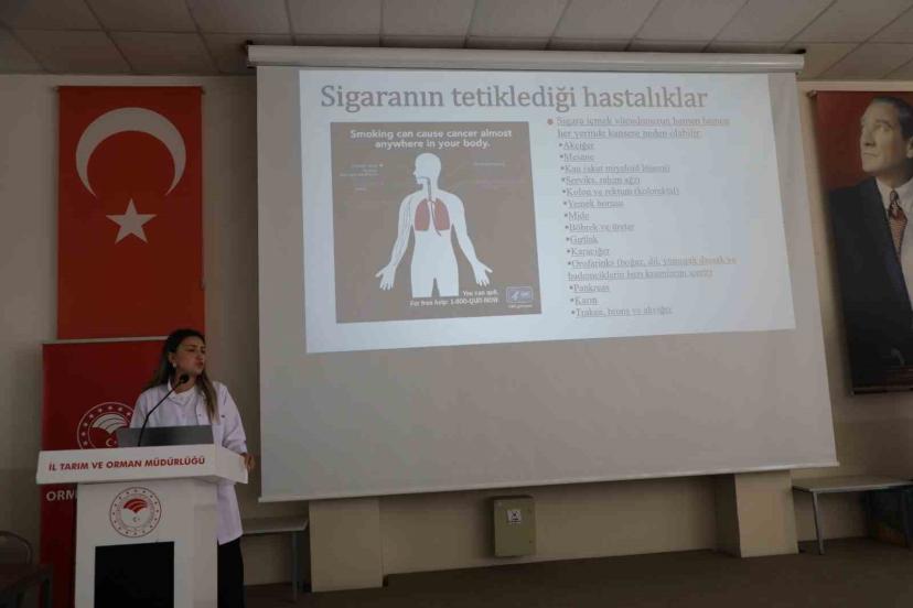 ’2024-2028 Tütün Kontrolü Strateji Belgesi ve Eylem Planı’ çerçevesinde yer alan ’Kamu kurumlarında sigara bırakma kampanyasının düzenlenmesi’ faaliyetleri sürüyor. Bu çerçevede, 20 Ağustos 2025 tarihinde İl Tarım ve Orman Müdürlüğü’nde Dr. Pakize Gizem Topçu tarafından ’Tütün ve Tütün Ürünlerinin Zararları’ konulu bilgilendirme eğitimi gerçekleştirildi. Eğitimin ardından, ’Yerinde Sigara Bırakma Danışmanlığı Hizmeti’ ile ilgili katılımcılara poliklinik hizmeti sunuldu.
