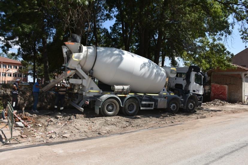Eskişehir’in İnönü ilçesinde yıkılma tehlikesi bulunması sebebiyle belediye ekiplerince yıkılan 30 metrelik okul duvarı yeniden yapılıyor.